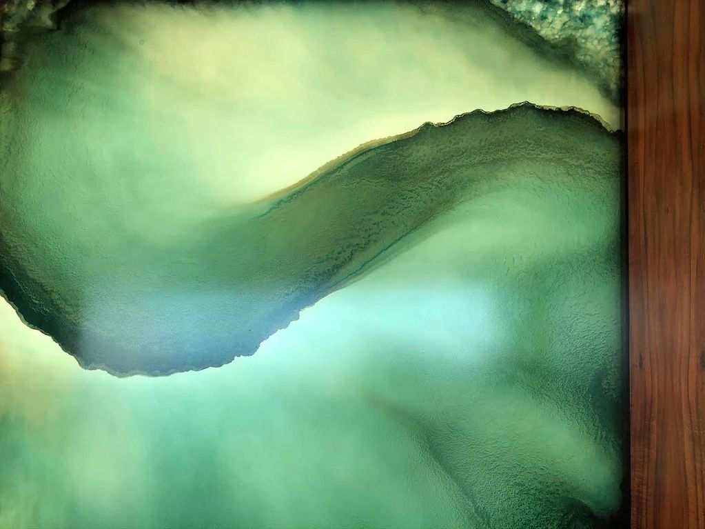5' x 6' backlit painting on glass. Wynia developed the technique for a client who wanted an under sea feel.