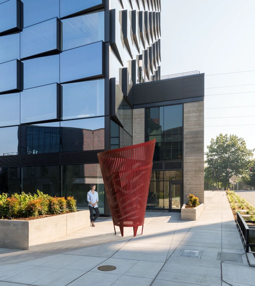 Gyravant is a 9' sculpture that will enliven the corner at the new Facebook headquarters in Bellevue’s Spring District. The sculpture was laser cut from ¼” steel, rolled, welded and powder coated. As the viewer moves around the sculpture, a mesmerizing moiré action appears. Designed to spark curiosity and engage viewers, the piece presents an opportunity for a shared public experience.